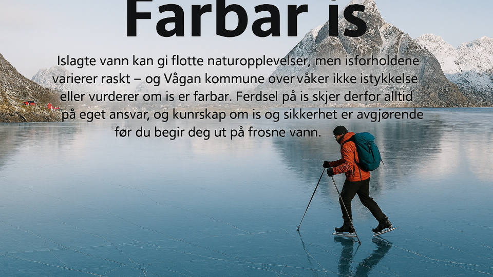 Islagte vann og farbar is Islagte vann kan gi flotte naturopplevelser, men isforholdene varierer raskt – og Vågan kommune overvåker ikke istykkelse eller vurderer om is er farb...