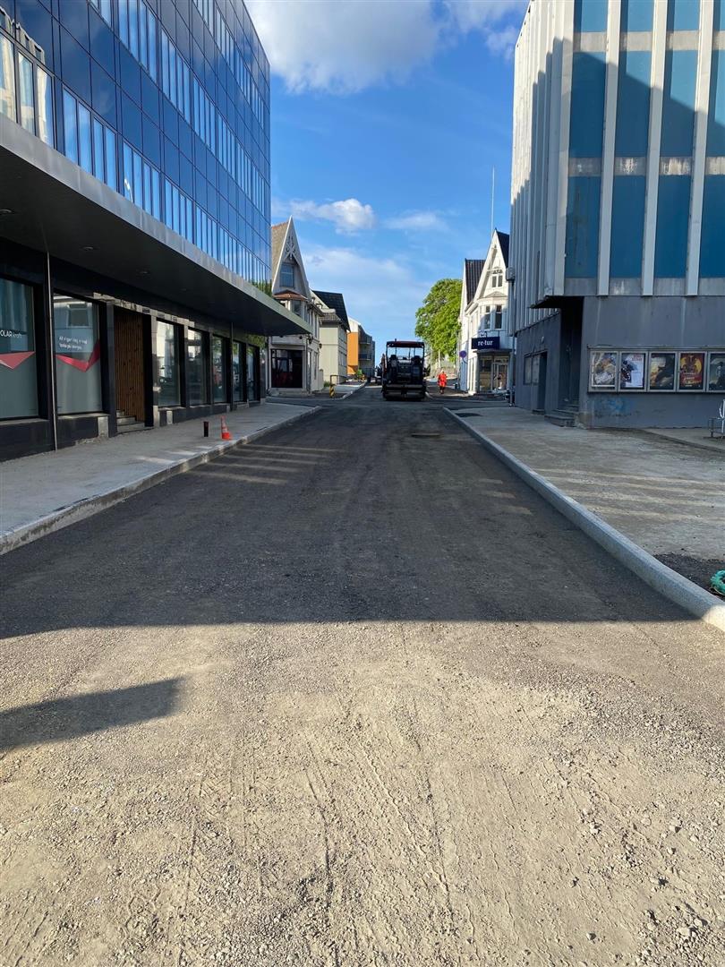 Storgata er nå ferdig asfaltert mellom kryssene Gymnasgata og Håkon Kyllingmarks gate. Sperringer er fjernet og gata er åpnet for trafikk.