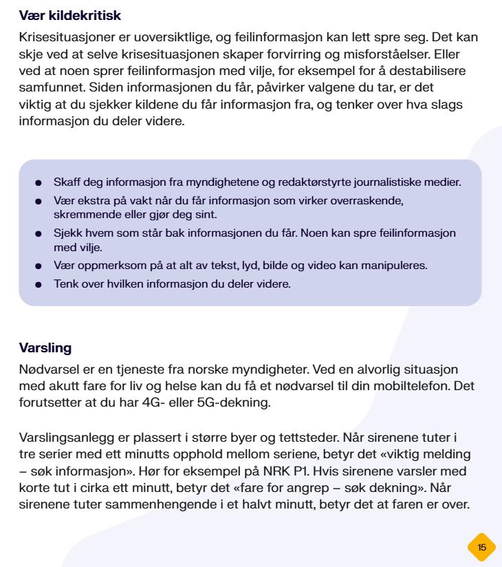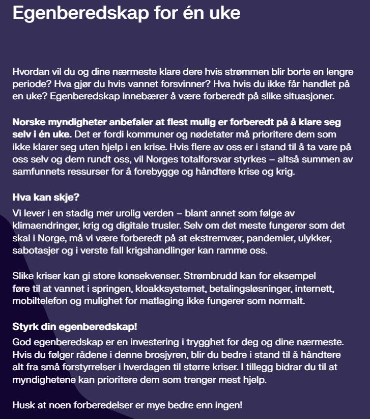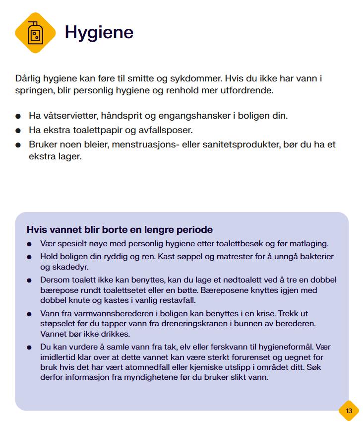 Sørg for at du ikke får umiddelbare problemer dersom vannet skulle bli borte, eller bli av dårlig kvalitet. Tenk også på andre i husstanden, vil disse klare å finne vannet dersom du er indisponibel hvis/når hendelsen treffer? Vi oppfordrer til å følge DSBs råd så langt som praktisk mulig.